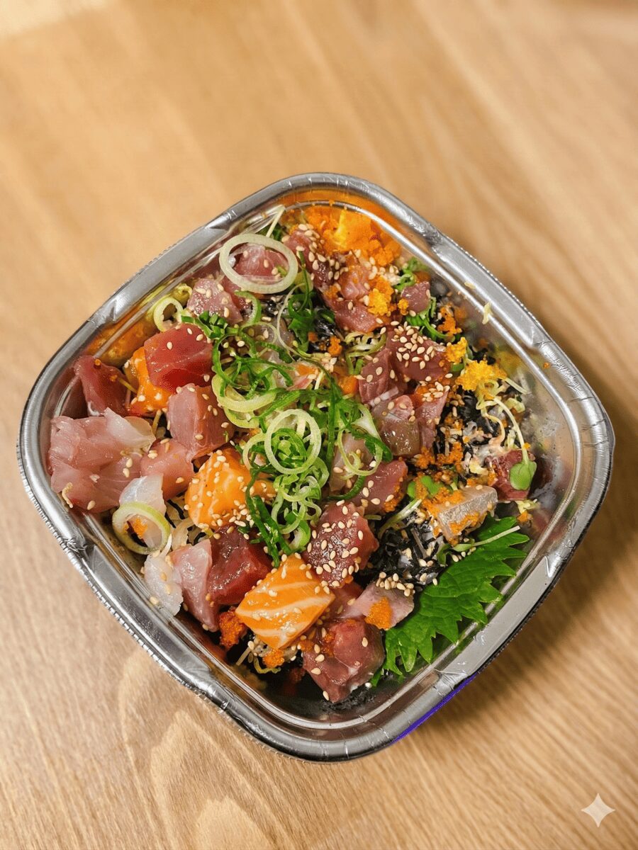 海鮮丼は数種類の魚を使っており、ネギや海苔、とびっこといったトッピングも手を抜いていない。ボリュームがある上に種類が豊富なので満足感がより増すのだ。