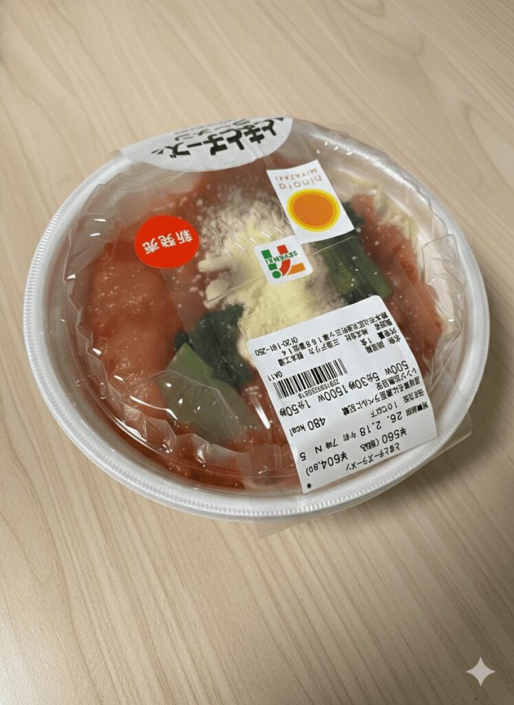 家に帰って電子レンジで5分ほど温めて実食。チーズのインパクトが強めでトマトが弱体化されていました。