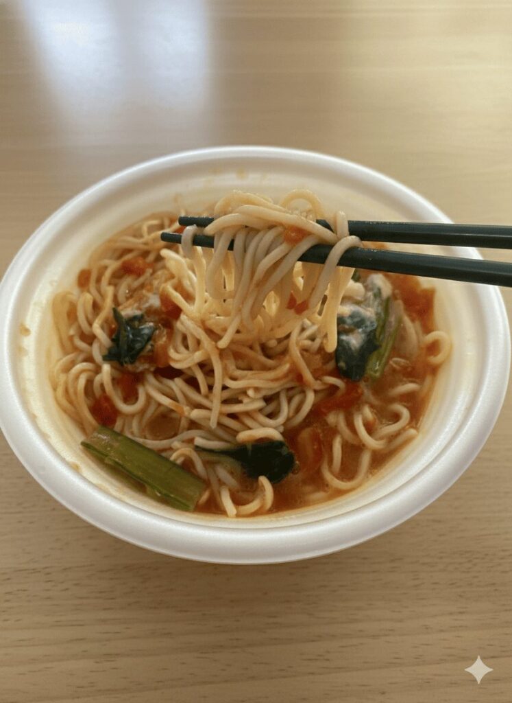 後日セブンイレブン延岡浜町店へ行き、別の記念商品である「とまとチーズラーメン」なるものを買ってみました。あまり人気がないのか、それとも大量に作りすぎてしまったのか、鬼の洗濯板パンもトマトチーズラーメンもたくさん在庫がありました。