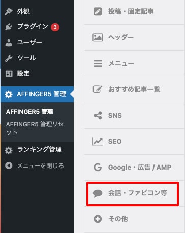 WordPress管理画面から、AFFINGER5管理 → 会話・ファビコン等を選択。