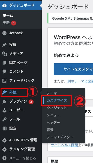 WordPress管理画面 → 外観 → カスタマイズを選択。