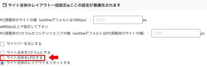WordPress管理画面 ▶︎ AFFINGER管理 ▶︎ 全体設定 ▶︎ サイト全体をLP化する ▶︎ 保存