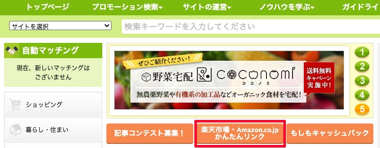 もしもアフィリエイトにログイン後、「楽天市場・Amazon.co.jpかんたんリンク」を選択します