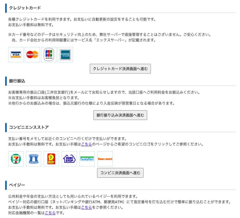 エックスサーバーの支払いにはクレジットカードがおすすめです。支払いの自動更新や支払い手数料が無料になります。