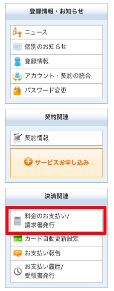 ログインすると画面右側にメニューが表示されるので、決済関連の項目の中から「料金のお支払い/請求書発行」を選択します。
